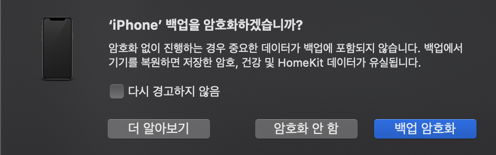 이 기기에 한번도 연결한 적이 없다면, iPhone 백업을 암호화하라는 창이 뜬다. 이 부분은 백업에 관한 설정인데, 암호화를 하지 않으면 중요 데이터는 빼고 백업이 되고, 백업 암호화를 하면 중요데이터를 포함한다. 백업 암호화에 대한 자세한 내용