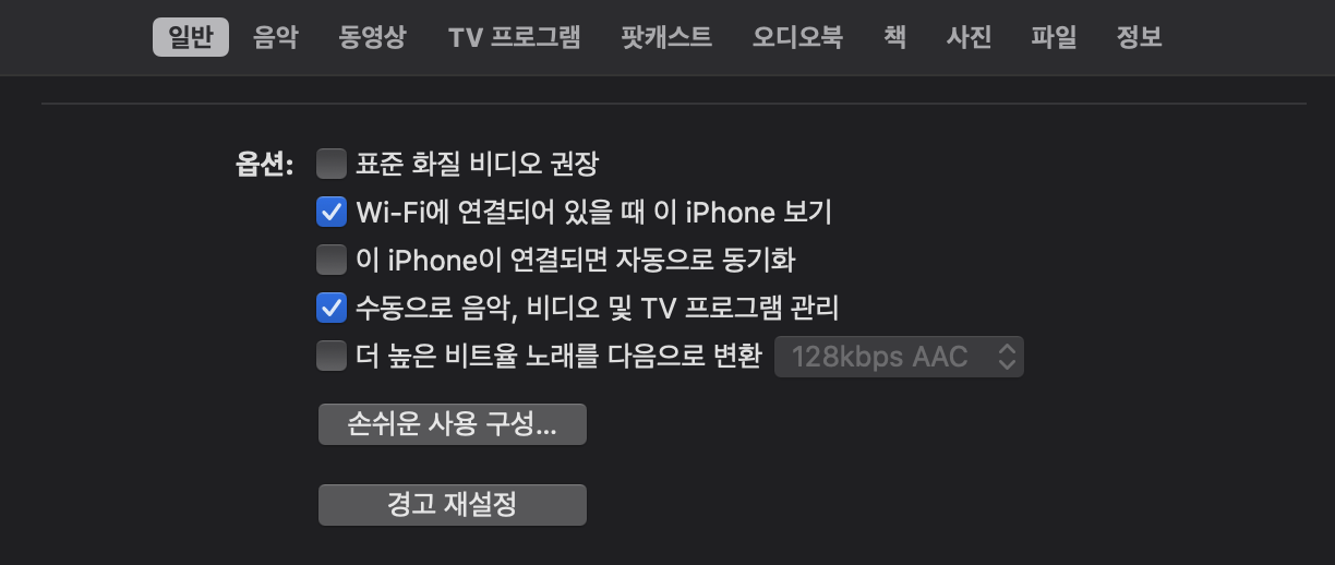 Wi-Fi에 연결되어 있을 때 이 iPhone 보기 를 체크하면 Mac과 iPhone이 같은 Wi-Fi에 연결되었을 때 wireless로 연결할 수 있다.